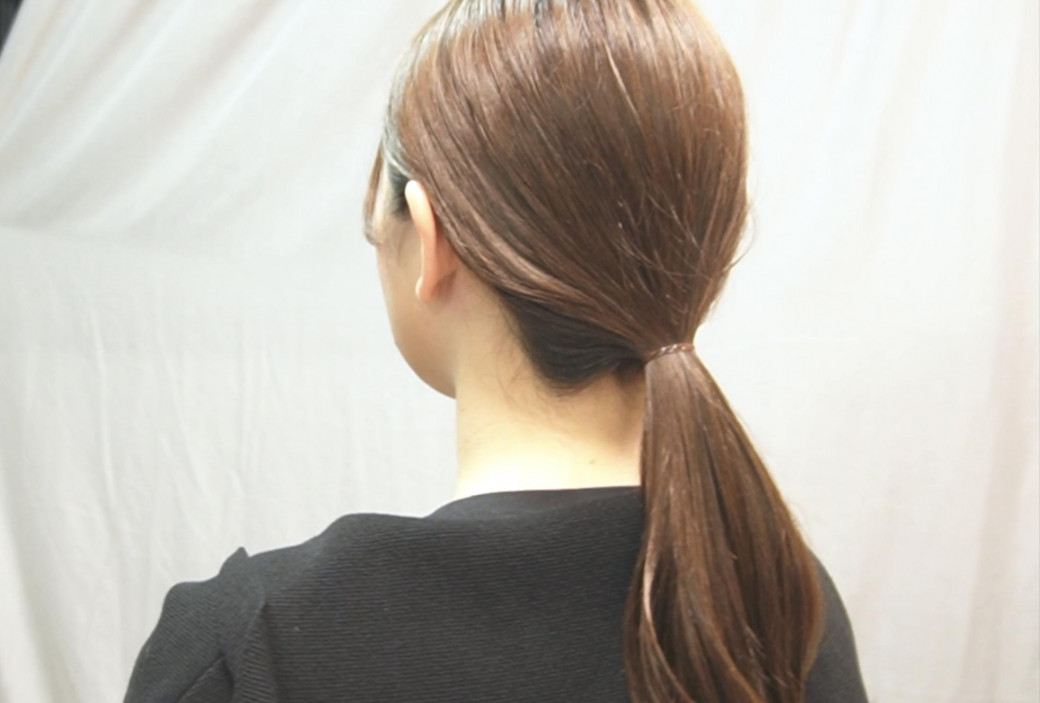 ①の毛先と落ちている髪の毛を合わせてポニーテールにします。