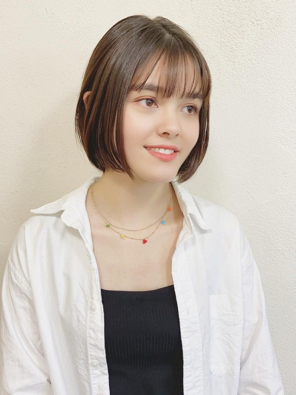 前下がりのショートボブフォルムにしているので、顔まわりに毛流れがあることで女らしさを感じさせつつ、トレンドのストレートタッチな質感も映える。