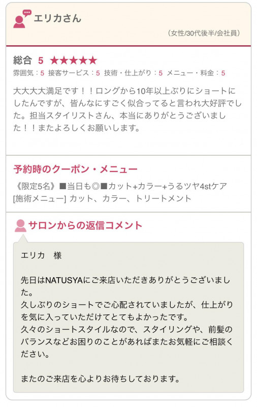 NATSUYAにはショートヘアを得意とするスタイリストが多数在籍しております。これまで2万人以上のあらゆる髪質や骨格のお客様を担当してきました。髪の乾かし方や、スタイリングの方法などアフターサービスも充実しています。是非一度お任せください♪