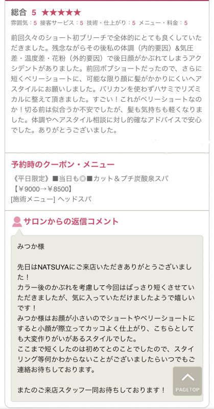 NATSUYAにはショートヘアを得意とするスタイリストが多数在籍しております。これまで2万人以上のあらゆる髪質や骨格のお客様を担当してきました。髪の乾かし方や、スタイリングの方法などアフターサービスも充実しています。是非一度お任せください♪